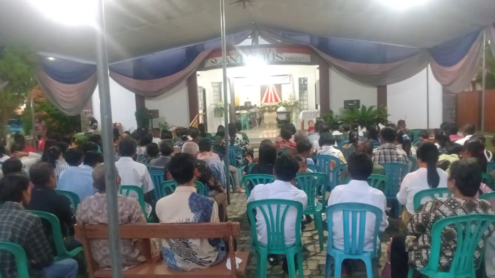 Pringsewu (SP) : Anggota Polsubsektor Ambarawa bersama Ansor Banser Nahdlatul Ulama (NU),dan Perhimpunan Pemuda Hindu (Peradah) ikut amankan kegiatan Umat Katholik Stasi Ambarawa dalam perayaan misa Vijili Paskah di Gereja Santo Antonius Padua Saptu, 19/4/2025.