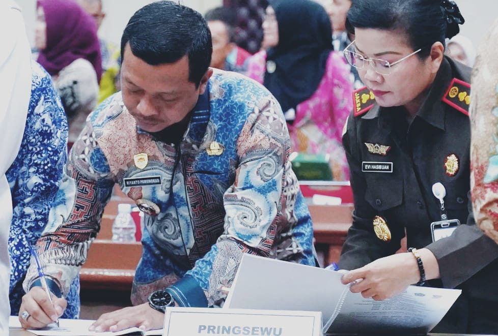 Pringsewu (SP) : Bupati Pringsewu Riyanto Pamungkas dan Kepala Kejaksaan Negeri Pringsewu Evi Hasibuan menandatangani perjanjian kerjasama dalam rangka optimalisasi penanganan dan penyelesaian perkara berdasarkan keadilan restoratif serta pelaksanaan pidana kerja sosial bagi pelaku tindak pidana.