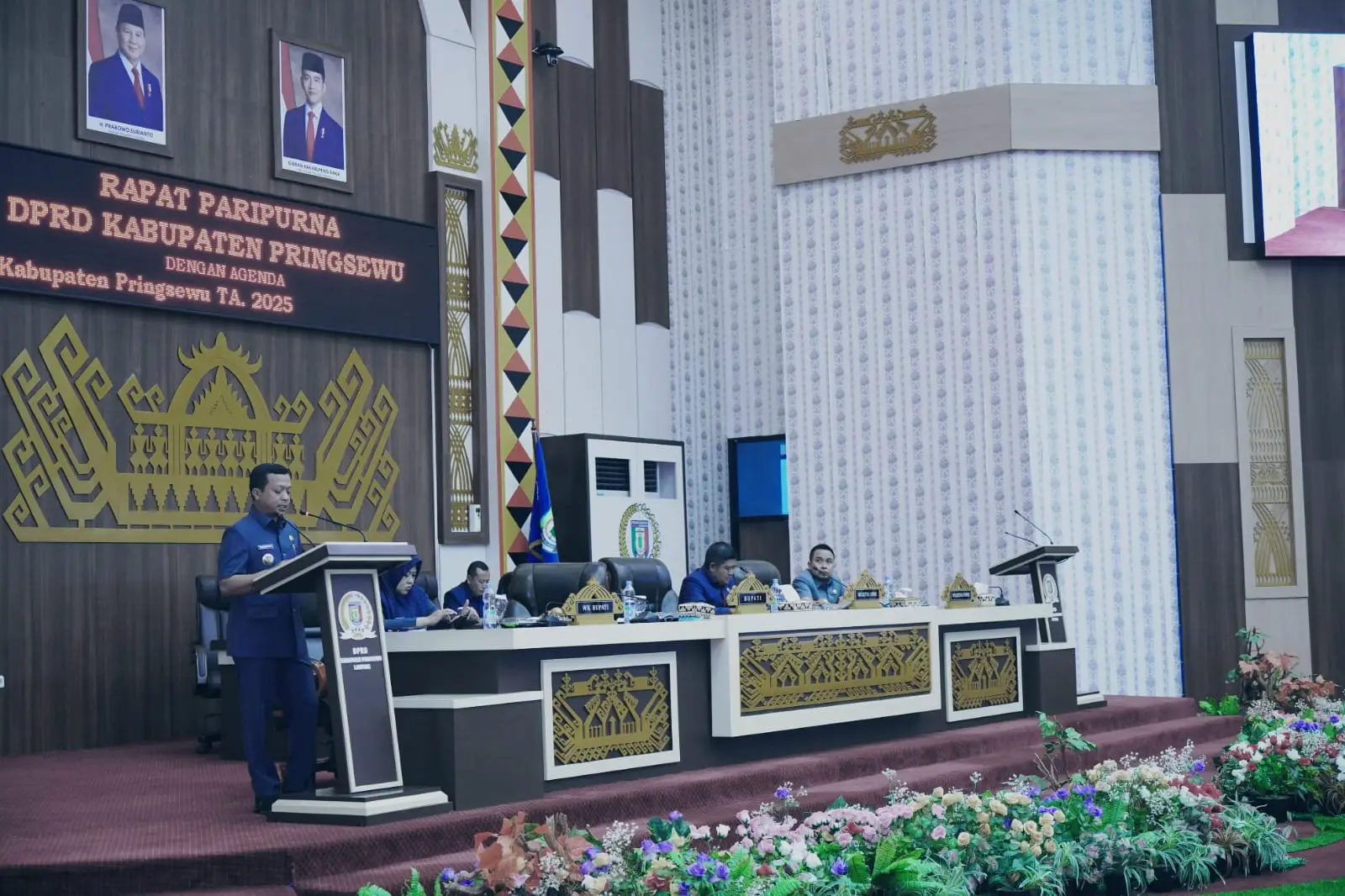 Rapat paripurna DPRD Pringsewu yang dipimpin Wakil Ketua I Bambang Kurniawan, dihadiri Wakil Bupati Pringsewu Umi Laila beserta jajaran pemerintah daerah dan forkopimda serta elemen lainnya, diikuti 32 dari 40 anggota DPRD Kabupaten Pringsewu.(Gus)