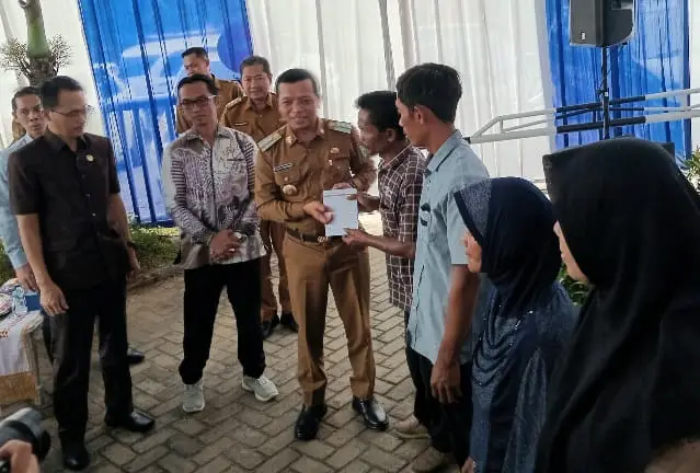 Pringsewu (SP) : Bupati Pringsewu Riyanto Pamungkas menyerahkan bantuan sosial Rumah Tinggal Layak Huni (Rutilahu) kepada warga Kabupaten Kabupaten Pringsewu. Bantuan secara simbolis diserahkan bupati di halaman kantor Bank Lampung Pringsewu, Senin (5/5/2025).