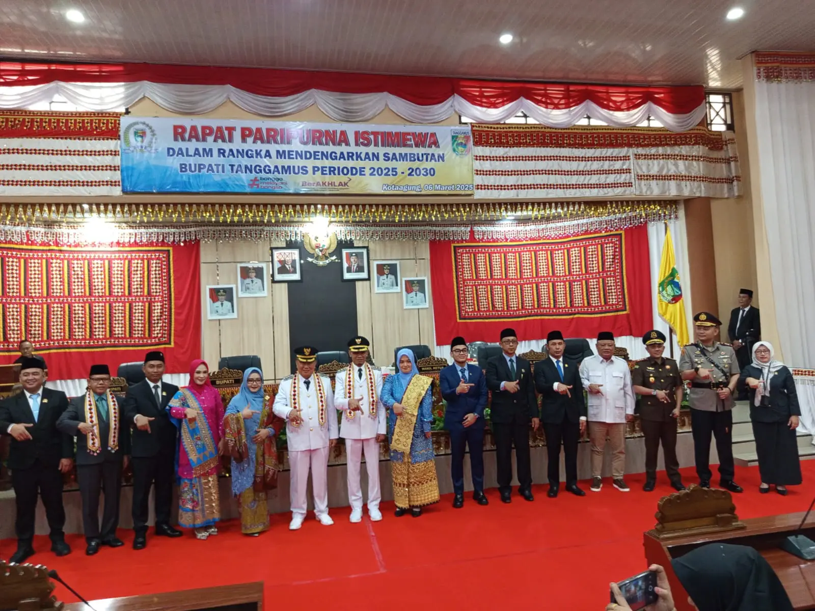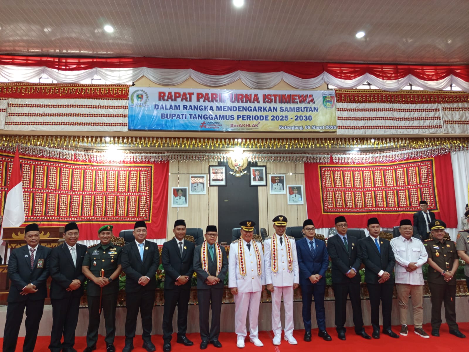 “Alhamdulillah penyelenggaraan Pemilihan Umum Kepala Daerah (Bupati dan Wakil Bupati) Kabupaten Tanggamus berjalan dengan tertib, aman dan lancar. Telah dilantik Presiden Prabowo pada 20 Februari di Istana Merdeka, sehingga pada hari ini kita dapat melaksanakan Rapat Paripurna Istimewa dalam rangka Mendengarkan Sambutan Perdana Bupati Tanggamus periode 2025-2030”, ujar Agung Setyo Utomo.