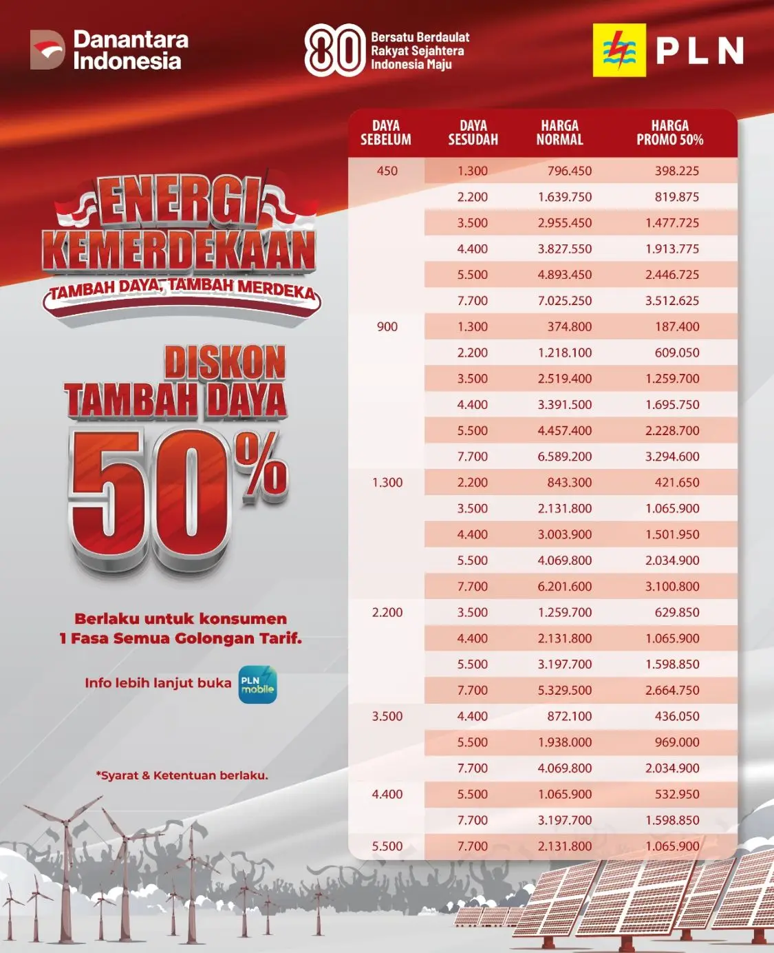 Pringsewu (SP) : Dalam rangka sambut 80 Tahun Indonesia Merdeka PLN Kabupaten Pringsewu memberikan promo tambah daya untuk konsumen. Ketentuan promo tambah daya tersebut di mulai dari tanggal 10 hingga 23 Agustus 2025.