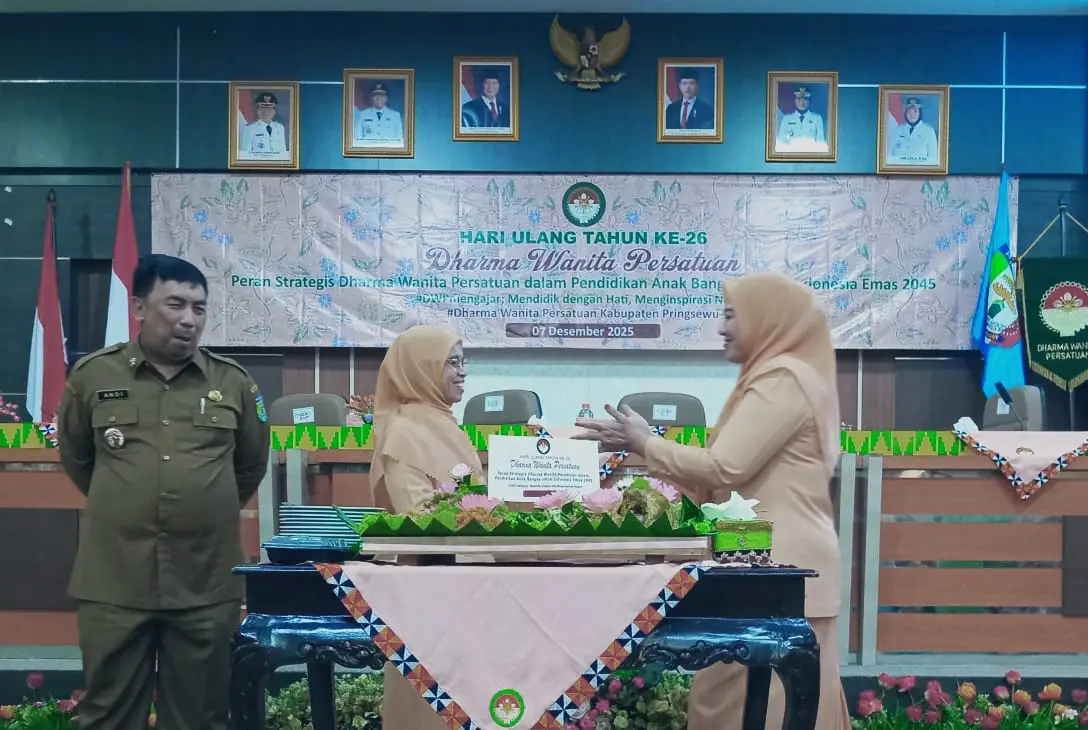 Pringsewu (SP) : Bupati Pringsewu Riyanto Pamungkas diwakili Sekretaris Daerah Kabupaten Pringsewu Ir.M.Andi Purwanto, S.T., M.T. mengajak seluruh anggota Dharma Wanita Persatuan (DWP) untuk menjadikan momentum HUT ke-26 DWP sebagai sarana merefleksi diri dan bersyukur, sekaligus memanfaatkannya sebagai ajang pengembangan potensi para anggota guna menyongsong Indonesia Emas. Ajakan tersebut disampaikannya pada acara HUT ke-26 DWP di Aula Utama Kantor Bupati Pringsewu, Selasa (9/12/2025).
