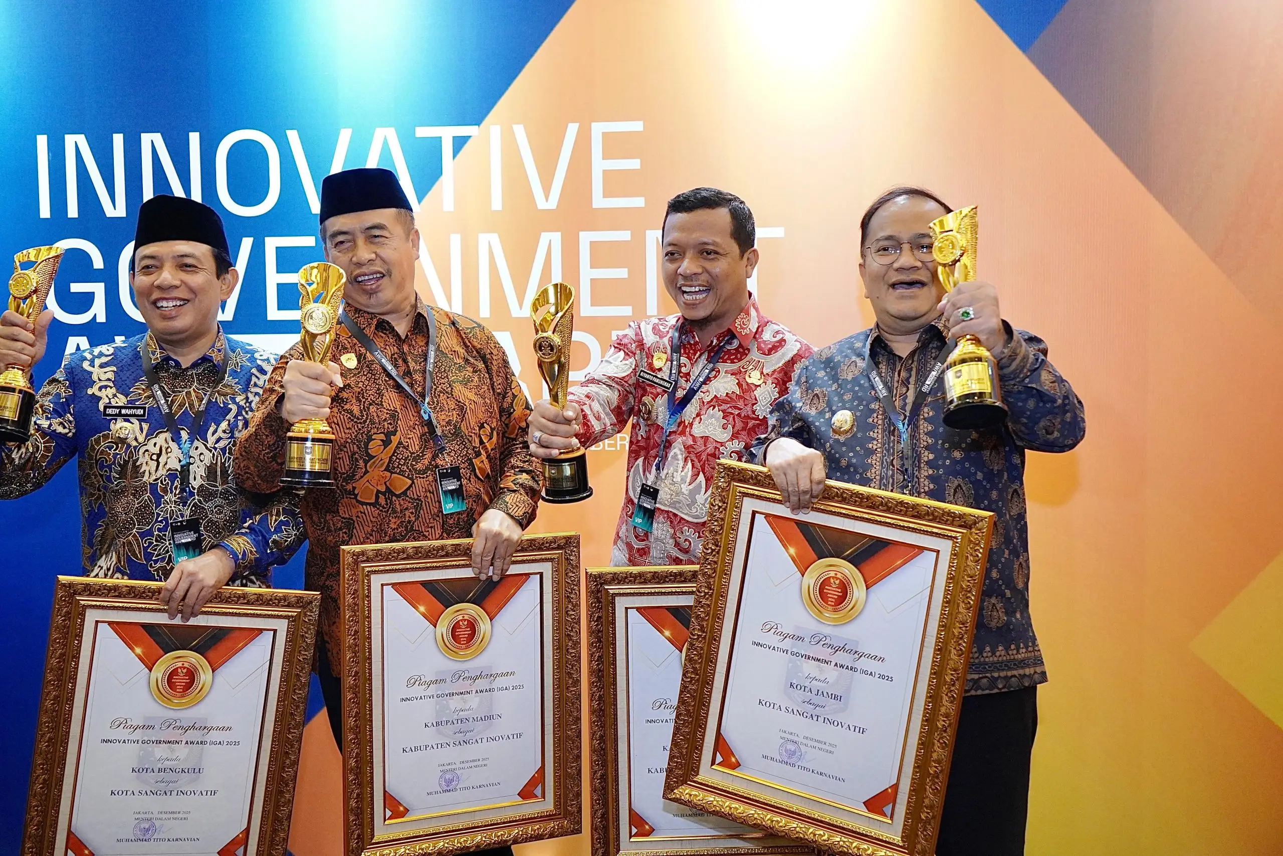 Pringsewu (SP) : Pemerintah Kabupaten Pringsewu kembali meraih penghargaan dari Badan Strategi Kebijakan Dalam Negeri (BSKDN) Kementerian Dalam Negeri RI. Penghargaan berupa Innovative Government Award (IGA) 2025 sebagai Kabupaten Sangat Inovatif, diterima oleh Bupati Pringsewu Riyanto Pamungkas pada acara penganugerahan IGA 2025 di Hotel Indonesia Kempinski, Jakarta, pada Rabu (10/12/2025).