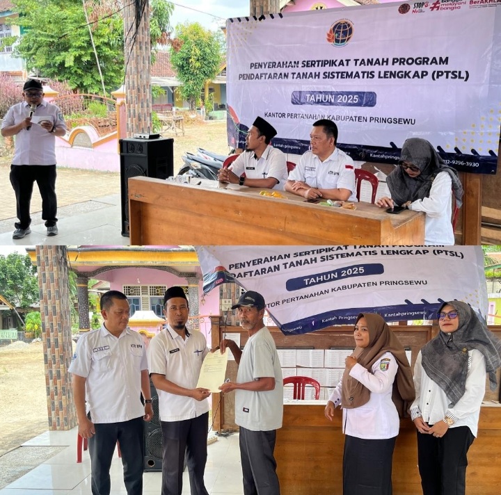 Pringsewu (SP) : Kantor Pertanahan Kabupaten Pringsewu melaksanakan kegiatan Pembagian Sertipikat Pendaftaran Tanah Sistematis Lengkap (PTSL) Tahun Anggaran 2025 pada Selasa, 28 Januari 2026. Kegiatan ini bertempat di Pekon Tambahrejo Barat, Kecamatan Gadingrejo, Kabupaten Pringsewu.