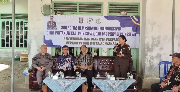 Pringsewu (SP) : Kejaksaan Negeri Pringsewu bersama Dinas Pertanian Pringsewu memfasilitasi kegiatan penyerahan bantuan Corporate Social Responsibility (CSR) dari Persatuan Pengusaha Penggilingan Padi (Perpadi) Kabupaten Pringsewu kepada kelompok tani penerima manfaat dalam Program Petani Mitra Adhyaksa, yang dilaksanakan pada Kamis, 6 November 2025 sekira pukul 10.30 WIB di Pekon Tanjung Anom, Kecamatan Ambarawa, Kabupaten Pringsewu, Kamis 6/11/2025.