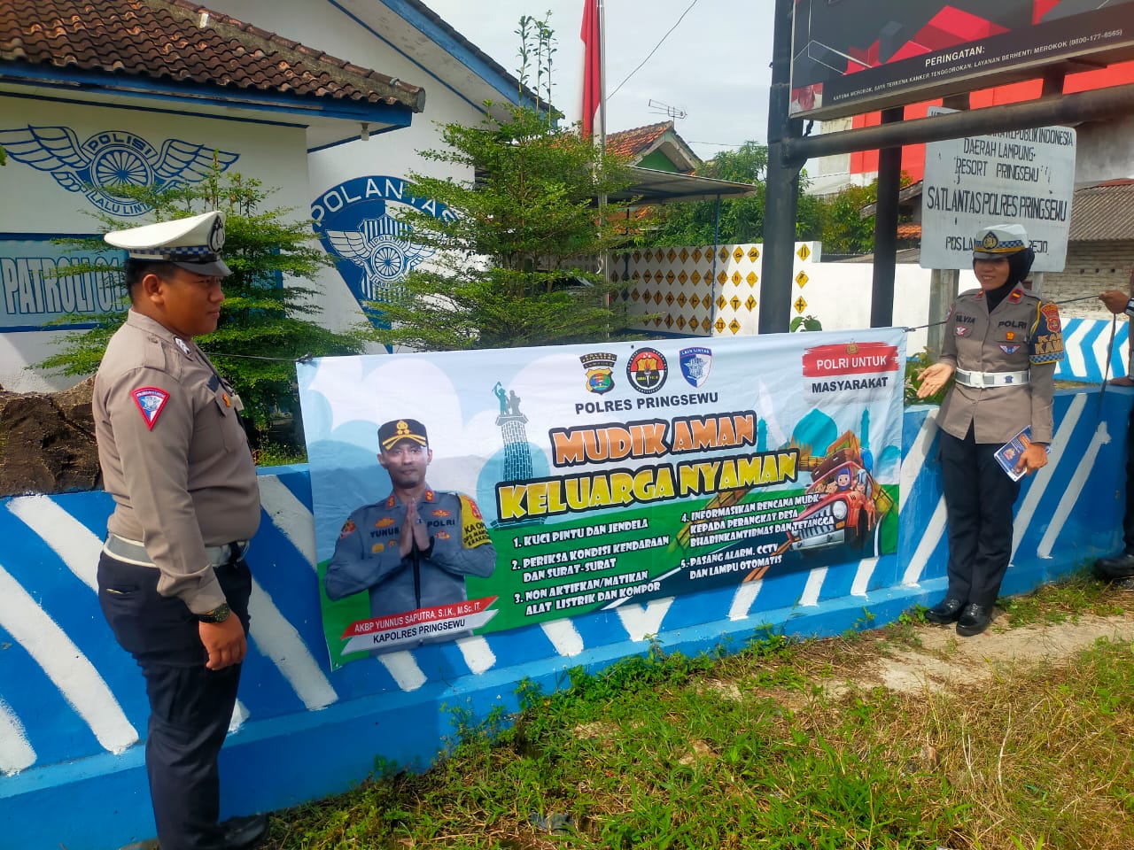 Pringsewu (SP) : Memasuki masa mudik Lebaran 2025, Satuan Lalu Lintas (Satlantas) Polres Pringsewu memasang sejumlah banner himbauan keselamatan di berbagai titik strategis di Kabupaten Pringsewu, Lampung. Langkah ini dilakukan sebagai bentuk antisipasi dan edukasi kepada para pemudik agar perjalanan mereka lebih aman dan lancar.
