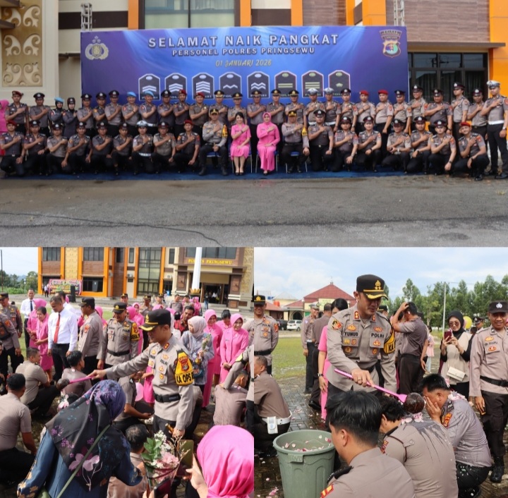 Sebanyak 51 personel Polri di lingkungan Polres Pringsewu resmi menyandang pangkat setingkat lebih tinggi. Mereka terdiri dari 5 perwira dan 46 bintara. Usai upacara, seluruh personel yang naik pangkat menjalani prosesi mandi kembang sebagai tradisi yang sarat makna kebersamaan dan harapan.