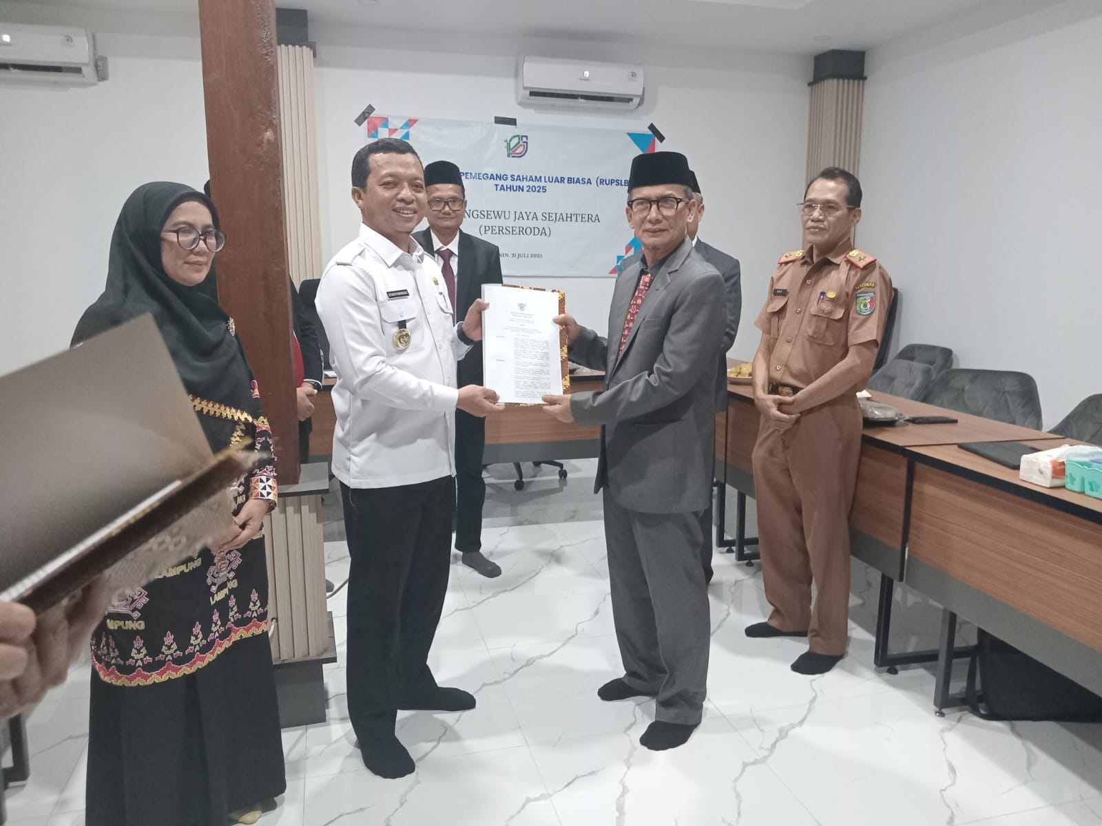 Pringsewu (SP) : Bupati Pringsewu Riyanto Pamungkas membuka sekaligus memimpin Rapat Umum Pemegang Saham Luar Biasa (RUPSLB) Perseroan Daerah PT.Pringsewu Jaya Sejahtera di Aula Graha Pamungkas, Pringkumpul, Pringsewu Selatan, Senin (21 Juli 2025). RUPSLB ini membahas pengangkatan Komisaris serta Direksi PT.Pringsewu Jaya Sejahtera.