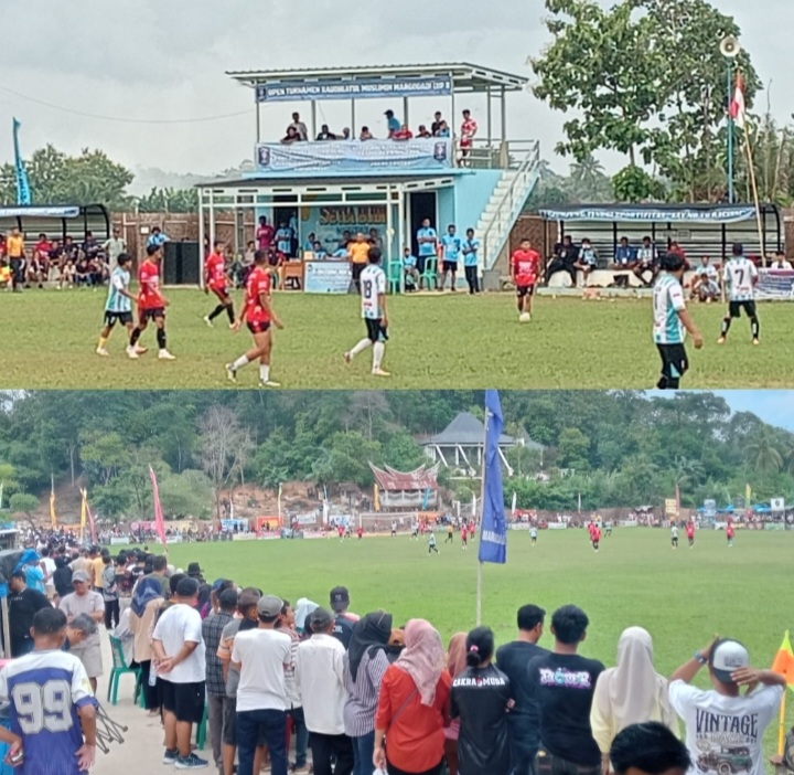 Pringsewu (SP) : Ribuan penonton padati lapangan hijau Setia Budi Margadadi Kecamatan Ambarawa Kabupaten Pringsewu untuk menyaksikan dua Tim Kesebelasan tangguh Cakra Muda FC Tambak Rejo Barat Kecamatan Gadingrejo berhadapan dengan Tim Banyuwangi FC Kecamatan Pagelaran Utara dalam pertandingan Turnamen Raudhatul Muslimin Cup 2 di putaran 32 Kamis 15/1/2026.